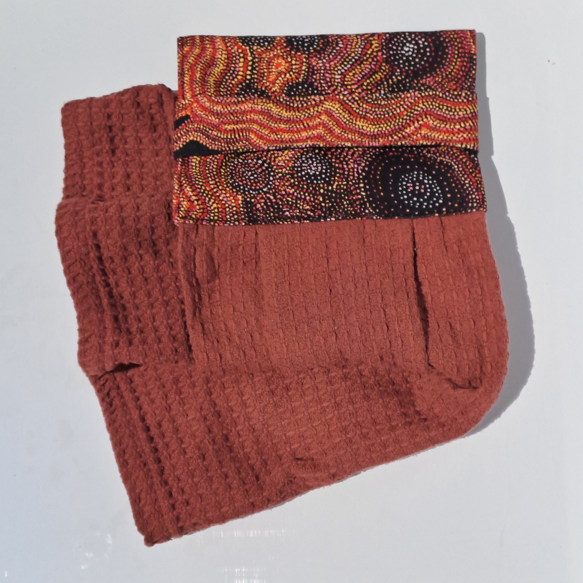 This unique tea towel features an indigenous designed fabric, inscribed with your choice of words, and a rust coloured cotton towel.