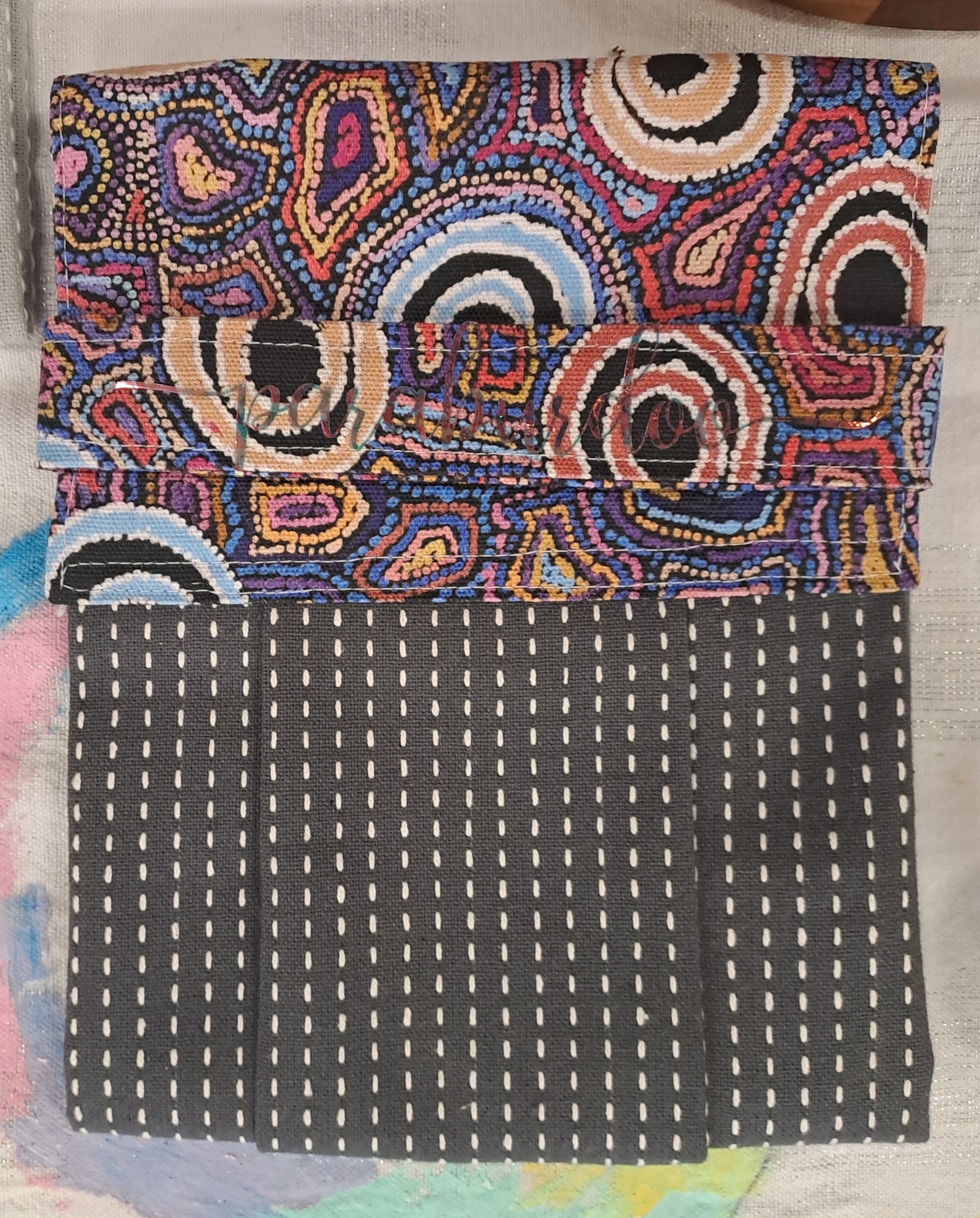 This unique tea towel features an indigenous designed fabric, Yumari Dreaming by Joy Nangala Brown, and a dark grey cotton towel.